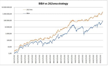 A very primitive strategy - one of the earliest I have backtested - is the 262 sma on S&P, which follows this simple rule: